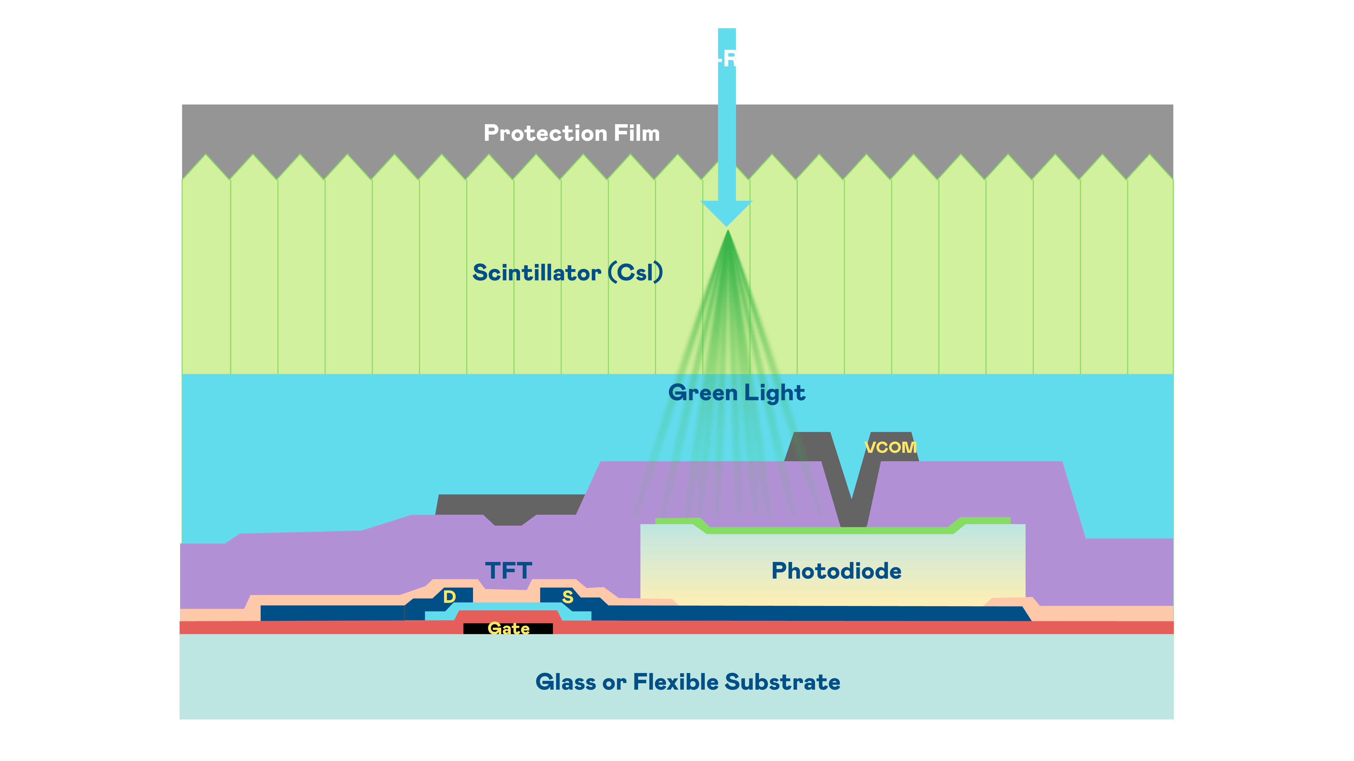 俄罗斯专享会的X光影像感测阵列使用薄膜电晶体 (TFT) 作为每个像素的读取开关,搭配光电二极体(Photodiode)的光电转换元件,用以感测X光影像讯号。